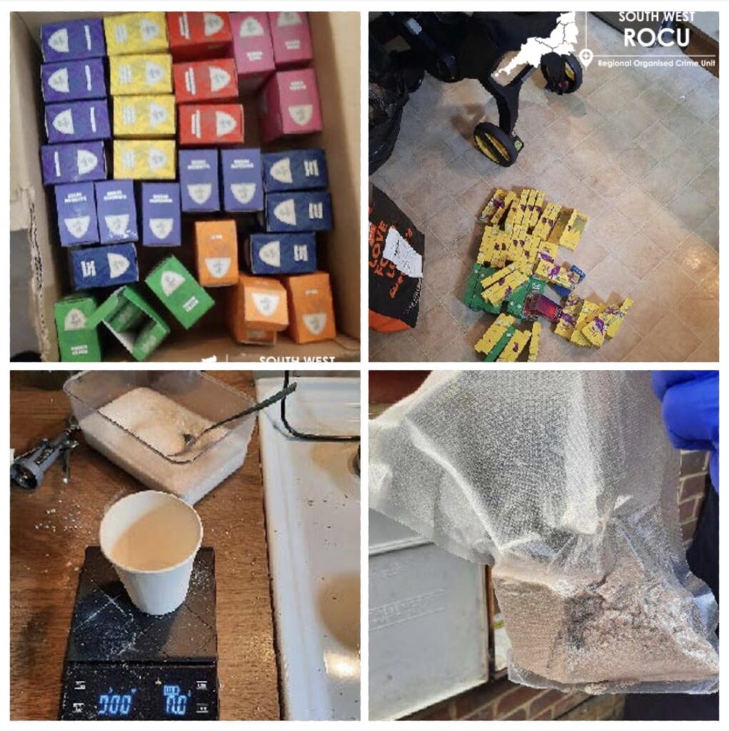 What they found when they entered the address were quantities of white powder scattered across the kitchen worktop, a bucket containing a kilo block of cocaine and bags of cannabis, hundreds of illegal vapes in boxes on the floor and on the shelves, and THC products and cannabis resin in the fridge. Paraphernalia associated with the preparation of drugs and equipment used for the packaging and posting of products were also prominent. In the open safe in the pantry more drugs were found in a plastic confectionary tub along with thousands of pounds of bundled cash.