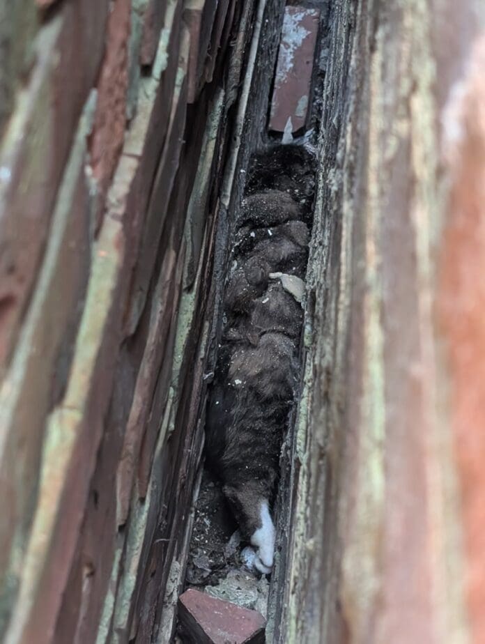The fire teams had to leave to respond to other jobs but Sarah and Morgan refused to give up. They looked at drilling into the gap from inside one of the houses but there was concern about the cat’s stress levels.
