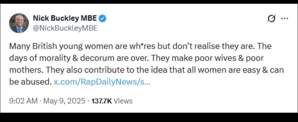 Keeping an MBE attached to a figure who openly describes young women as “whores” and implies they are responsible for their own abuse is not harmless oversight. It is institutional endorsement by inertia. It sends a clear message: that contempt for women is compatible with public honour, that cruelty can coexist with civic recognition and that misogyny is a forgivable excess so long as it is delivered in the right ideological accent.