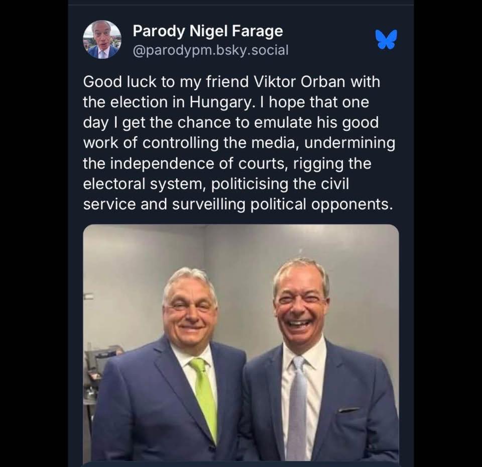 Farage has ensured any references to his buddy Victor Orban are erased from his X account. So, I thought it would be useful to share these just as a reminder of how close they were. ‘Orban is the future of Europe’ is my personal favourite!’. (Mark Cockerton)