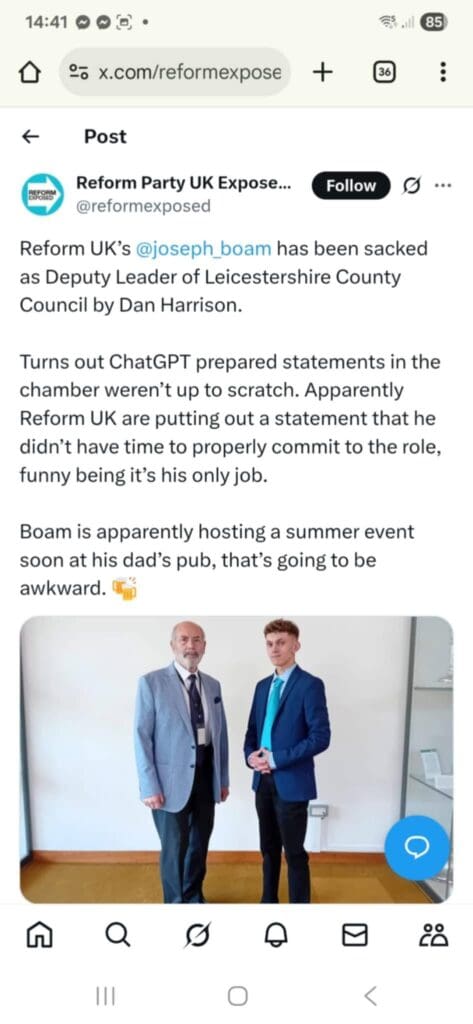 The discovery comes only months after Reform UK seized control of the council, unexpectedly ousting the Conservatives after two decades in power. Boam, 22, joined Reform last year after leaving the Conservative Party, citing “local corruption” as his reason. His father, Russell Boam, remains a Tory councillor in North West Leicestershire.