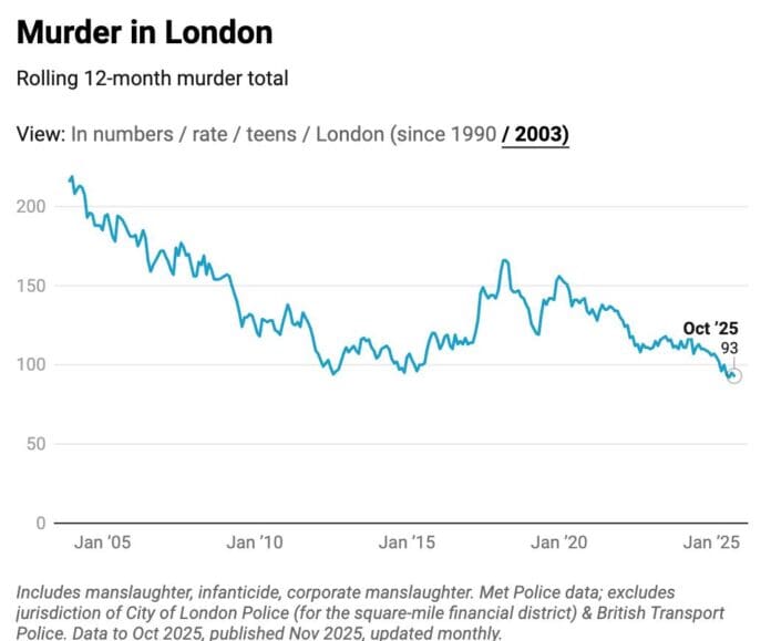The Mayor of London, Sadiq Khan, said: “There are some politicians and commentators who continue to denigrate London and talk our great city down, but the facts are showing a very different picture. The number of homicides in London in the first nine months of 2025 was lower than in any year since monthly records began 22 years ago.