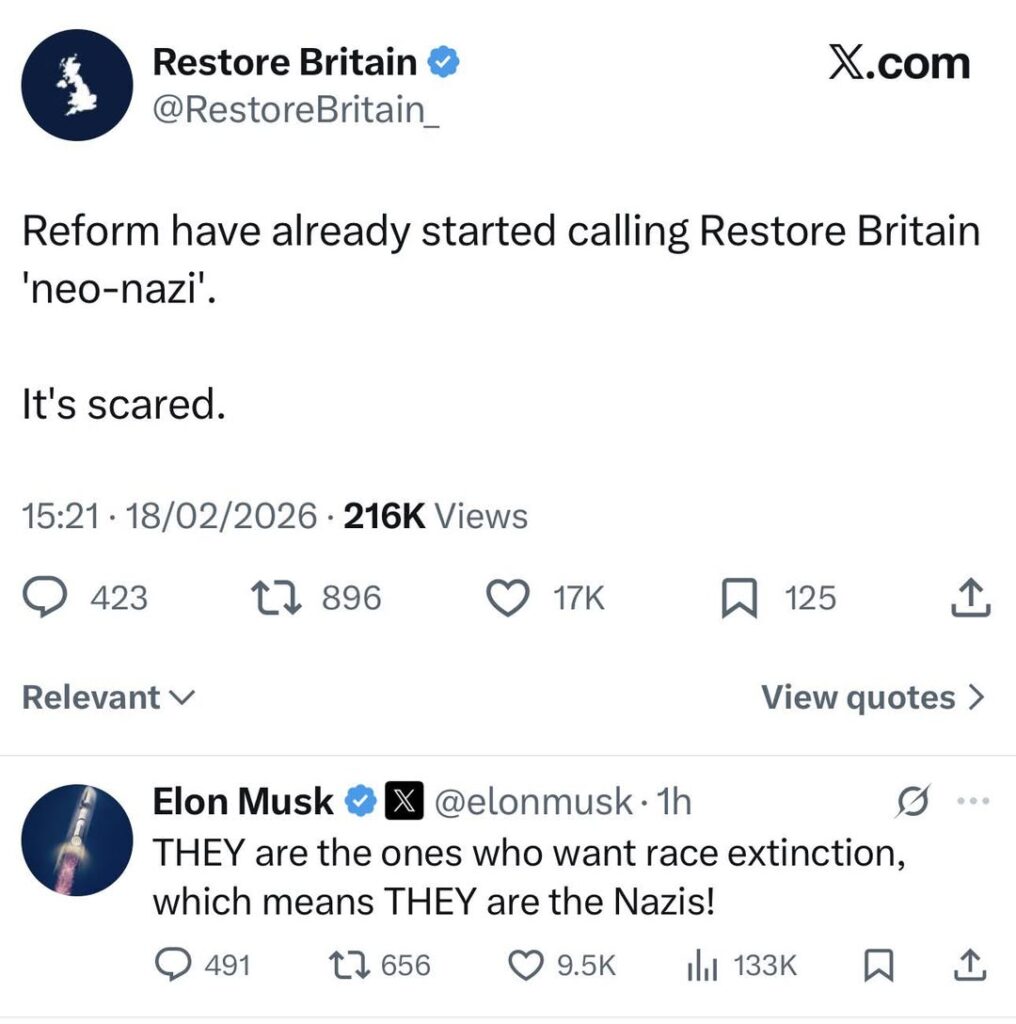 An account called “Restore Britain” posted on X, claiming that Reform had begun branding them “neo-Nazi”, adding, “It’s scared.” So far, so online. But then in barrels Elon Musk, platform owner, rocket mogul and self-styled free speech absolutist, with this gem: “THEY are the ones who want race extinction, which means THEY are the Nazis!”