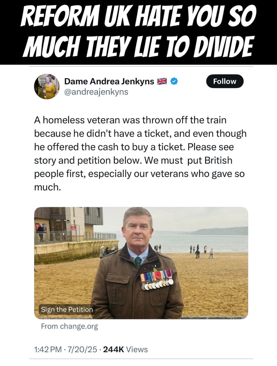 For those asking, the man in the photo of the petition is Anne-Marie’s husband, not the homeless veteran on the train.
