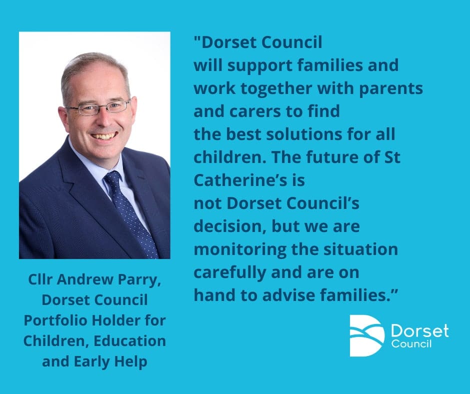 Dorset Council understands there are concerns about the future of St Catherine’s Catholic Primary School in Wimborne. The future of the school is not Dorset Council’s decision but we are on hand to support families and understand their concerns.
