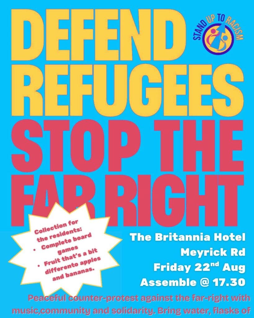 On Friday evening (21/8), Stand Up to Racism (SUTR) Bournemouth organised a counter-protest against a right-wing gathering at the Britannia Hotel. The SUTR event was a powerful display of community spirit, diversity, and peaceful resistance against the rising tide of nationalism and xenophobia.