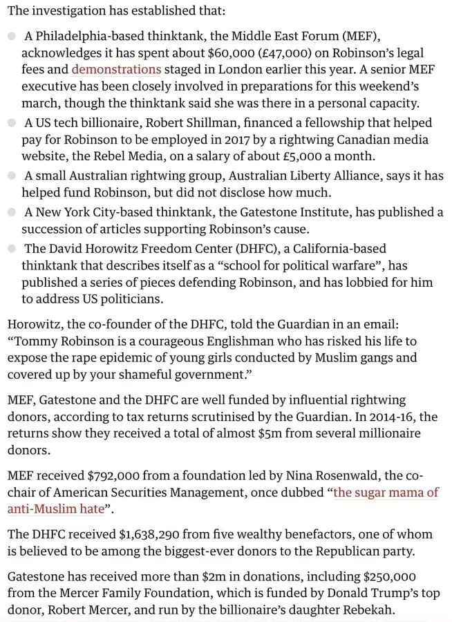 Their documented funding and support has been linked to actors in multiple foreign countries, including Russia, who seek to destabilize the UK; the United States, where far-right billionaires push a global agenda; and Israel, where certain groups lobby for specific foreign policy.