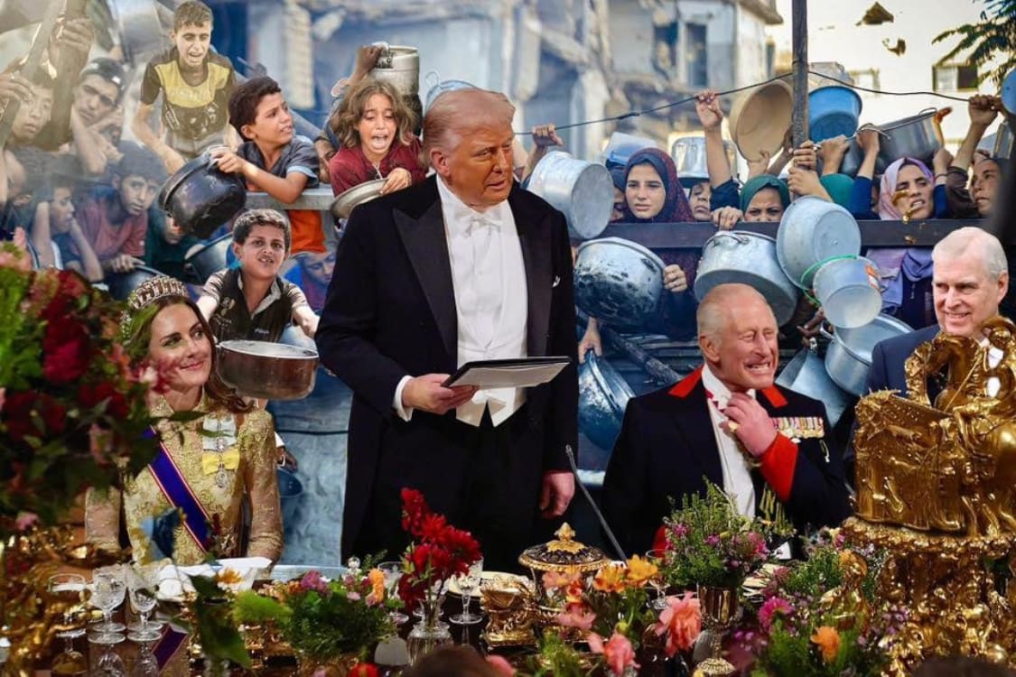 The most powerful men on Earth eating a million dollar banquet paid for by the humble British taxpayer. pic.twitter.com/SSwXZgtbT3