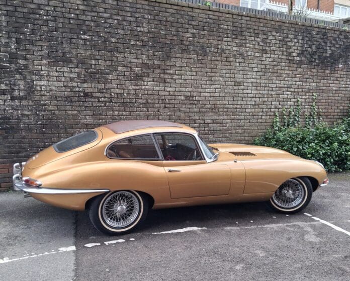 I saw this insane thing round the corner from our house the other day – a gold Jaguar E-Type with whitewall tires, ffs – and was beset with a torrent of the compound emotions that seem to be par for the course in my dotage.