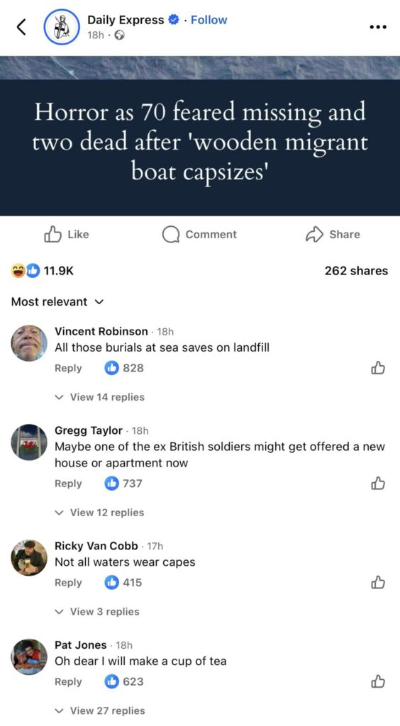 What is perhaps most sickening is not only that the following comments were written but also that so many people clearly felt comfortable applauding them. To look at a story involving death, terror and human beings disappearing into the sea and respond with jokes, mockery and gleeful contempt is genuinely chilling. It forces us to confront an ugly truth: somewhere along the way, compassion has been deliberately stripped away. These are not abstract headlines. These are mothers, fathers, sons, daughters—people so desperate they were willing to risk drowning for the mere possibility of safety. The idea that anyone can read that and respond with cruelty should leave every decent person with a knot in their stomach and tears in their eyes.