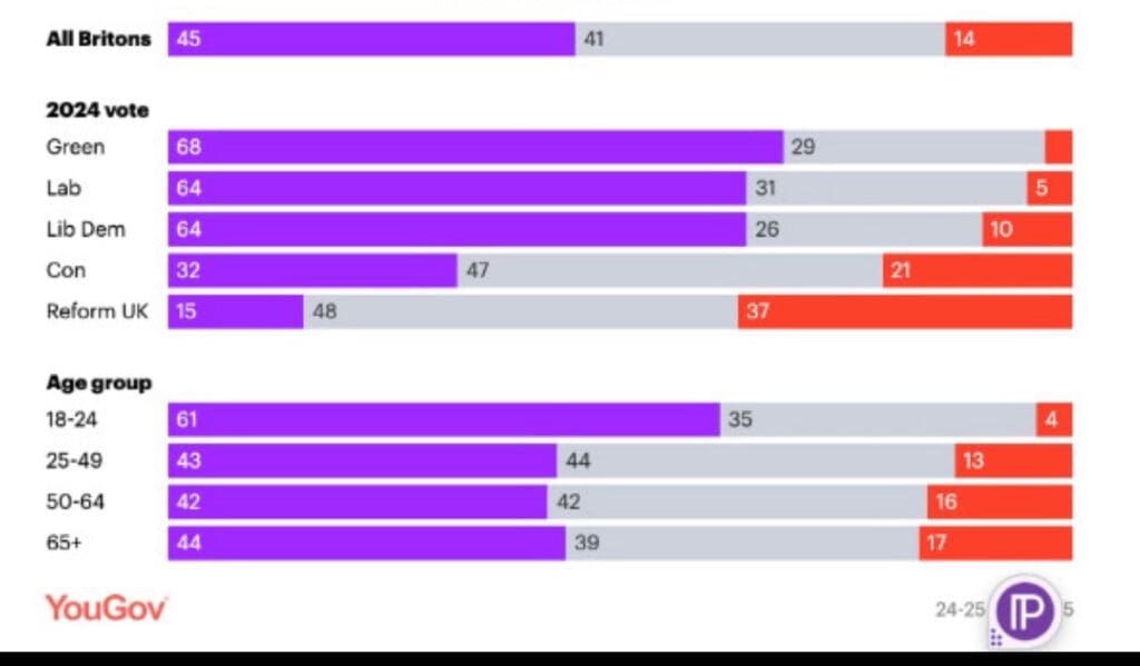 Only the far-right Reform UK voters tend to oppose recognising a Palestinian state, by 37% to 15%.